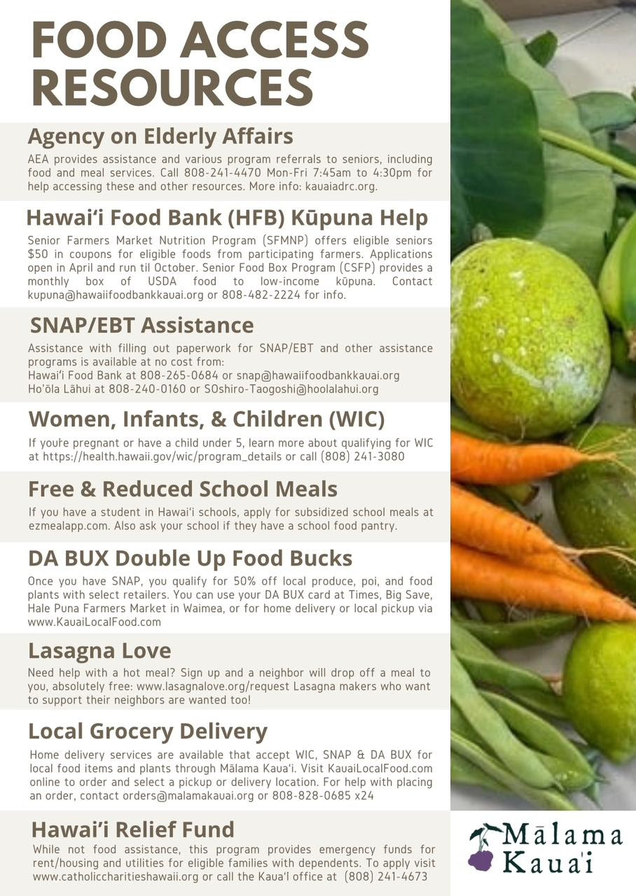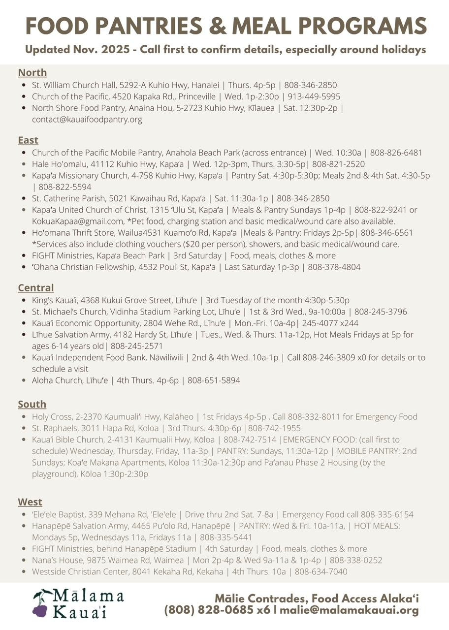 Malama Kaua`i has put together a list of food resources for anyone needing assistance. Please call first to confirm details, especially around the holidays.